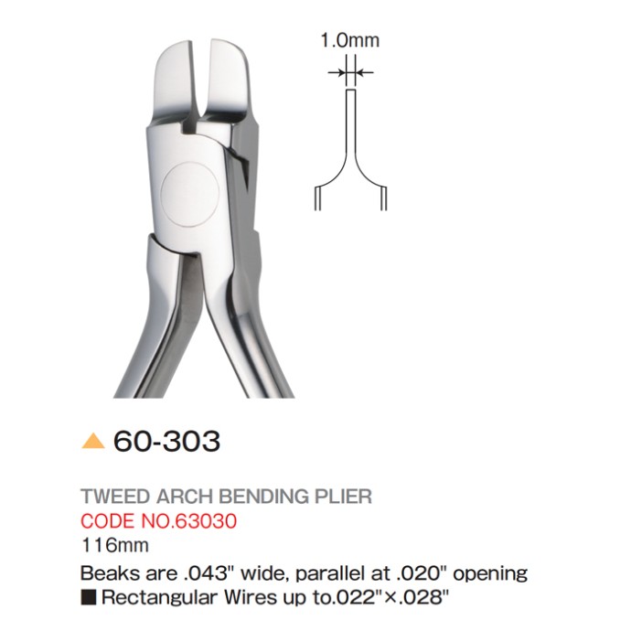 Tweed arch bending plier, beaks are .043'' wide, paraller .020'' opening, rectangular wires up to .022'' x .028'.
