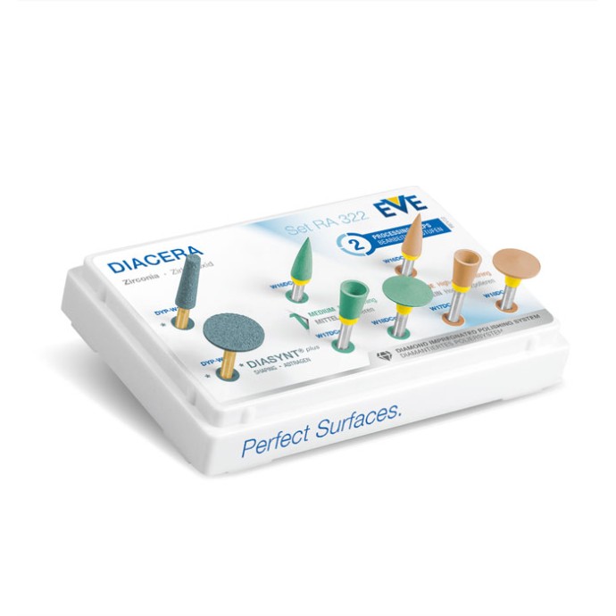 SET RA 322 , περιλαμβάνει 2 αδρόκοκκα για διαμόρφωση, 3 DIACERA RA μεσαίου κόκκου για προστίλβωση και 3 DIACERA RA λεπτόκοκκα για στίλβωση
