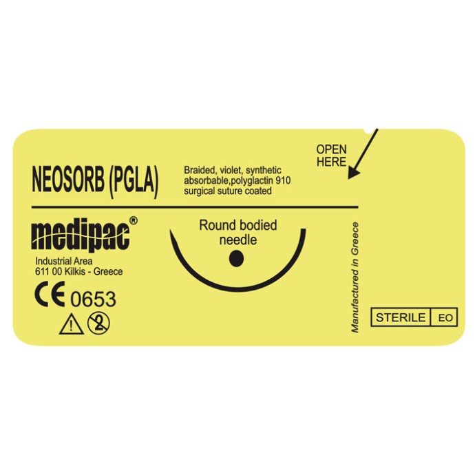Συνθετικό, απορροφήσιμο, πλεκτό, πολύκλωνο, ιώδες χειρουργικό ράμμα πολυγλακτίνης 910 με επικάλυψη.