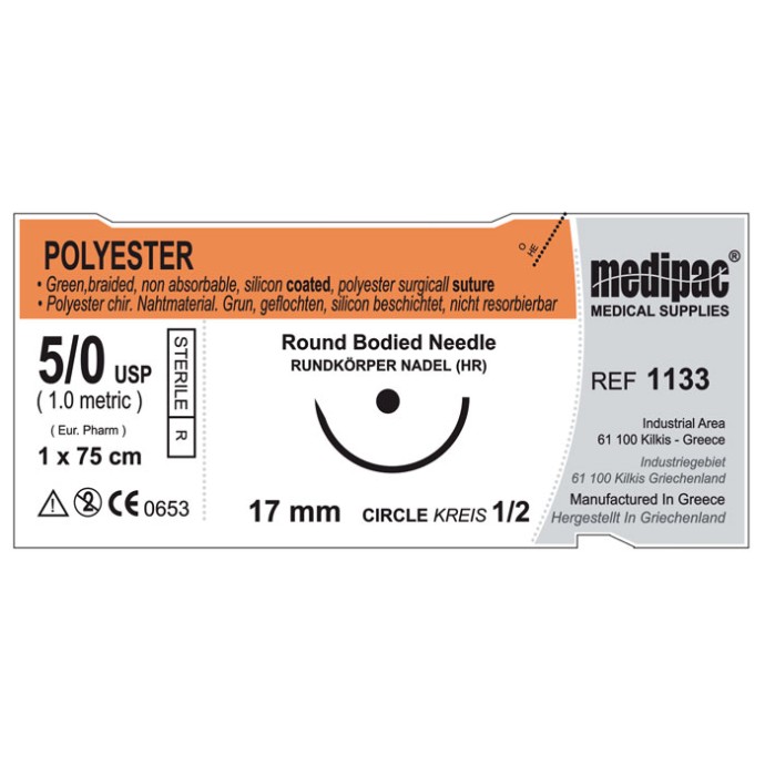 Μη απορροφήσιμο, πολύκλωνο, πράσινο χειρουργικό ράμμα από πολυεστέρα, επικαλυμμένο με σιλικόνη.