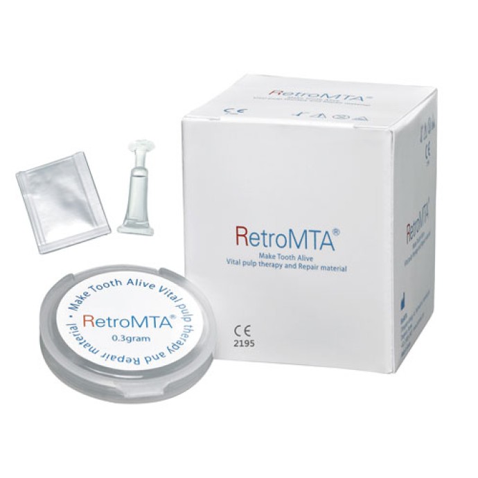 Το RetroMTA είναι ένα υδραυλικό βιοκεραµικό υλικό για επιδιόρθωση ρίζας και θεραπεία ζωντανού πολφού. Το RetroMTA αποτελείται από µικρά, υδρόφιλα σωµατίδια τα οποία πήζουν µε την παρουσία νερού.