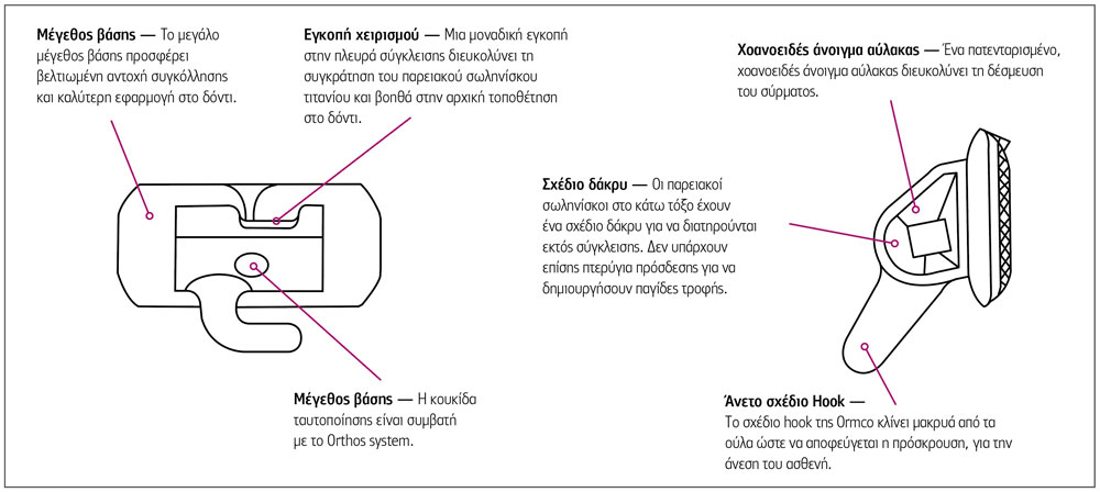 - Άνετο σχέδιο Hook — Tο σχέδιο hook της Ormco κλίνει µακρυά από τα ούλα ώστε να αποφεύγεται η πρόσκρουση, για την άνεση του ασθενή.